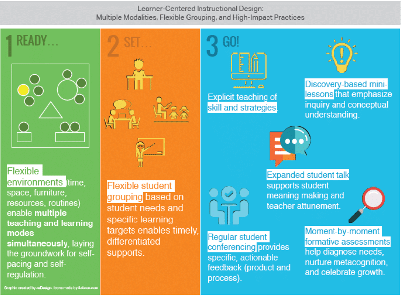 Students have access to multiple formats for learning. The physical organization of learning environments is flexible, allowing students to select the format that best meets their needs and is engaging. Classrooms may extend to outside of a school building. The teacher and student co-design the learning experience to ensure learning opportunities are maximized.