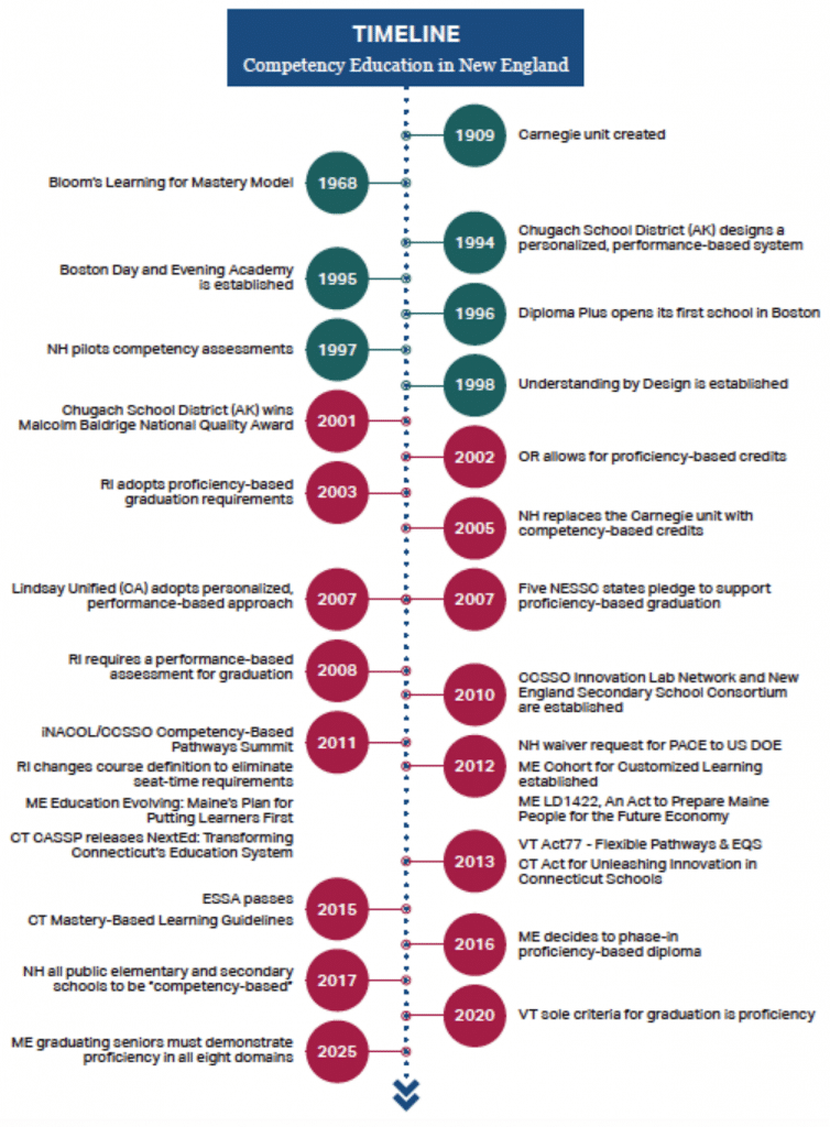 The New England region stands out for its early innovations, bold vision, and high percentage of districts becoming competency-based. Yet, a quick glance at the timeline shows that the earliest models popped up on both sides of the country – in Boston and Anchorage – around 1995. So why is it that competency-based education has taken hold in New England with such momentum?