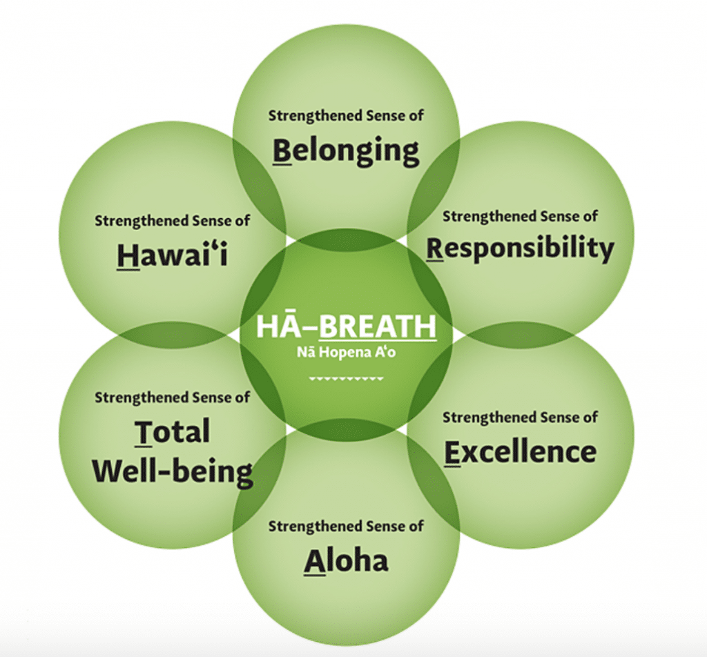 According to the Hawai’i Consolidated State ESSA Plan, HĀ, which means “breath” in the Hawai’ian language, is derived from Nā Hopena (“end goals”) A‘o (“learning and teaching”). HĀ “was developed through a widespread community process of dialogue, feedback and co-creation, and includes competencies designed to develop a strengthened sense of: