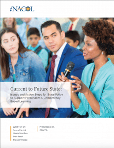 iNACOL’s new report, Current to Future State: Issues and Action Steps for State Policy to Support Personalized, Competency-Based Learning, articulates a vision for the future of K-12 education and offers steps state policymakers can take to create the conditions for personalized, competency-based learning to scale. This paper is designed for state policymakers, including governors, state legislators, state boards of education, state school chiefs and state policy staff, with a vision to catalyze transformational change in K-12 education toward a long-range vision for systems that help all students succeed.