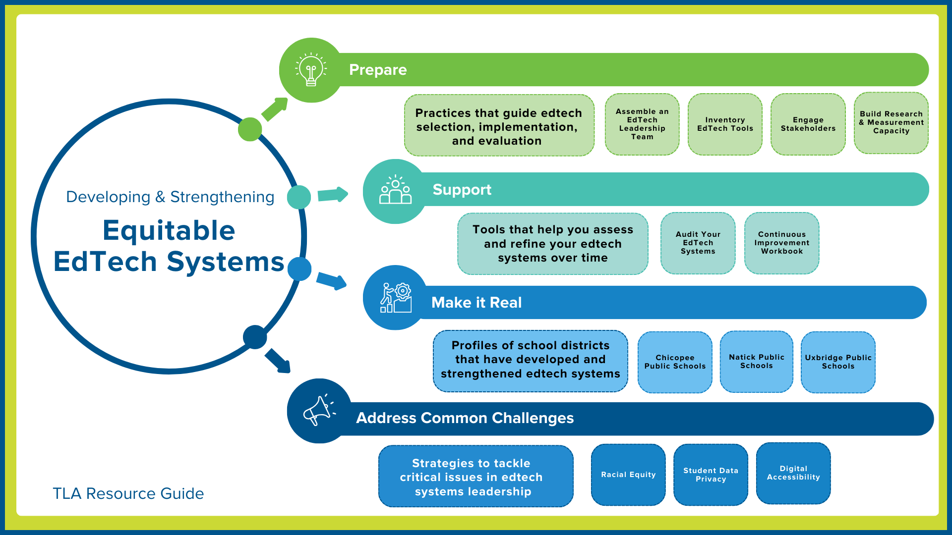 We’re excited to introduce 12 new resources designed to help edtech leaders seize these opportunities to develop and strengthen equitable edtech systems in their schools and districts. Developed through The Learning Accelerator’s (TLA) partnership with the Massachusetts Department of Elementary and Secondary Education’s Office of Educational Technology, these tools are crafted to support leaders in four key areas: