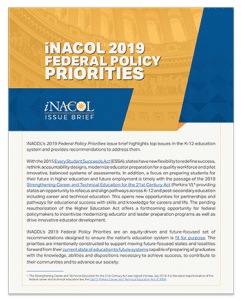 WASHINGTON, D.C. (January 30, 2019) —With a goal to ensure our nation’s education system is fit for purpose and better able to prepare students for the future, today iNACOL (@nacol) announced its policy agenda with the publication of two issue briefs, iNACOL 2019 State Policy Priorities and iNACOL 2019 Federal Policy Priorities.