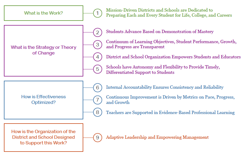Developed by 100 innovators in 2011, the working definition of a high-quality competency-based education was designed to build a shared understanding of how a competency-based system functions. However, it does not precisely describe what the competency-based structure (beliefs, policies, and operational mechanisms) is that would replace the traditional structure. In this section, we hope to outline the specific structures that districts and schools should have in place while still highlighting the innovations and variations developed by districts and schools. At times, structures that are considered “must-haves” or “non-negotiables” are identified.