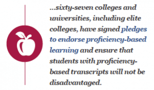 The introduction of competency-based education in institutions of higher education is also allowing new possibilities for creating a competency-based pipeline for students. The most promising example to date is in Presque Isle Maine, where the University of Maine’s campus is transitioning to a proficiency-based model that is very similar to the approach of the surrounding districts. In addition, Southern New Hampshire University’s College for America is exploring partnerships with districts and schools across the region. For example, students at Our Piece of the Pie® Academy in Hartford, Connecticut will be able to take advantage of competency-based dual enrollment courses at College for America, thereby opening the door to accelerated pathways from high school to a post-secondary certificate or degree.