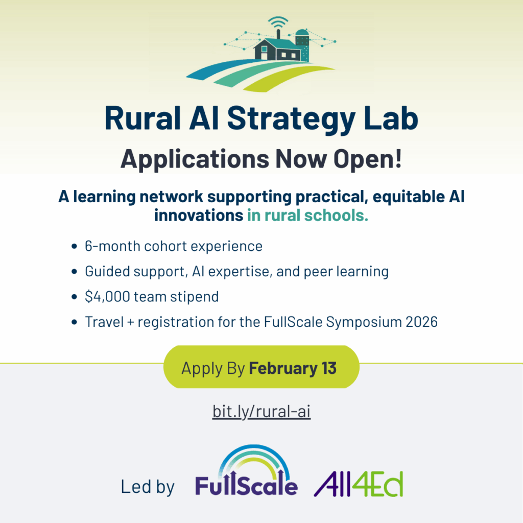 Led by FullScale in partnership with All4Ed, the Rural AI Strategy Lab is a six-month learning network that brings together 12–15 rural school and district (or charter network) teams to deepen or advance AI-powered work in their local contexts.