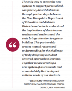 New Hampshire’s strategy starts with a belief that innovation takes place at the local level, drawing upon co-design strategies to build new systems such as graduation competencies and a new accountability system. It also emphasizes that in order to help students learn, schools need new capacities and teachers must be supported in building their skills. A NH Network Platform offers personalized professional development and the Performance Assessment for Competency Education (PACE) initiative is supporting teachers to create and use performance-based assessments that will allow students to engage in richer tasks and build higher order skills.