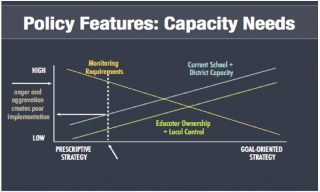 In comparison, a goal-oriented strategy that outlines a powerful vision and clear outcomes replaces monitoring with a complementary capacity-building effort to accelerate high-quality implementation. Without capacity building, districts are left to reinvent the wheel themselves, some producing dramatic innovations, while many will be burdened and frustrated by repeated trial and error. Similarly, in a goal-oriented strategy, innovation is likely to produce a variety of interpretations, approaches, and models of how to reach the goal. States will need to employ strategies to co-design new policies and construct the elements of the statewide systems to tap into the local expertise and ensure that they can accommodate the different models.