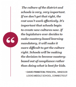 - Walk the talk by using similar guiding principles as those found in personalized, competency-based districts. It isn’t going to work for states to use traditional change and communication strategies if they want to move beyond the traditional system. For example, it will be difficult, if not impossible, to implement competency-based education through compliance strategies. Compliance assumes that the state knows exactly what should be done when, in fact, there are many ways to design personalized, competency-based models. The paradigm shift is too important to the process of transformation—educators and community members need the opportunity to learn, to reflect, and to decide that this is what they want to do. In addition, the large systemic changes have many implications to be considered. Co-design or collaborative processes that draw on multiple perspectives is a much stronger strategy.